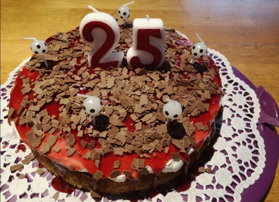 Kurz vor dem Anschneiden (Vollmilch-)Schokoladenstreusel auf dem Kuchen verteilen.